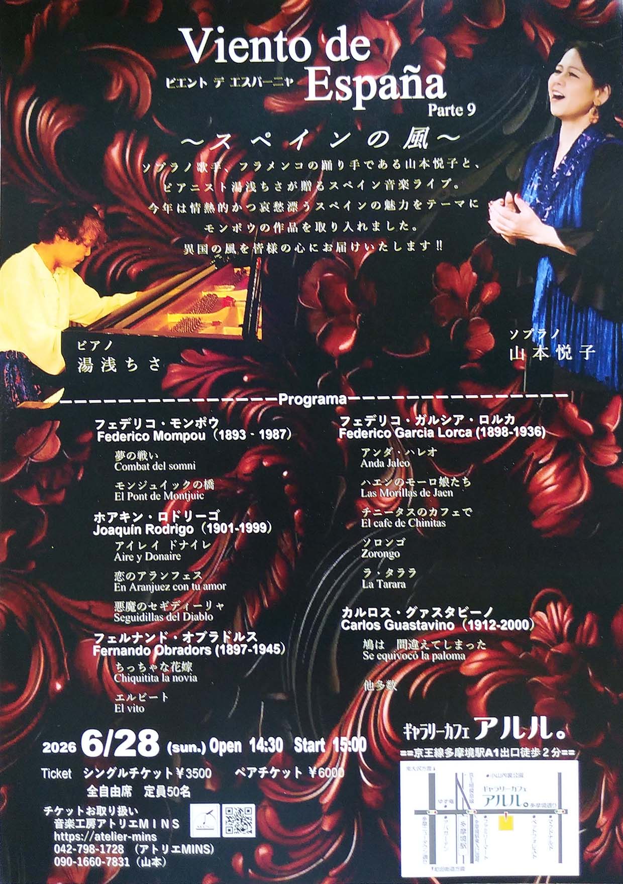 ■Etsuko & Chisa Duo Conciertoビエント デ エスパーニャ 〜スペインの風〜Parte 9 6月28日(日) 14:30開場 15:00開演 ソプラノ歌手、フラメンコの踊り手である山本悦子と ピアニスト湯浅ちさが送るスペイン音楽ライブ。 今年は情熱的かつ哀愁漂うスペインの魅力をテーマに モンボウの作品を取り入れました。 異国の風を皆様の心にお届けいたします !! シングルチケット3,500円 ペアチケット6,000円 全自由席 定員50名 チケットお取り扱い:音楽工房アトリエMINS https://atelier-mins.com 042-798-1728 アトリエMINS 090-1660-7831 山本 リーフレット 表 リーフレット 裏 |