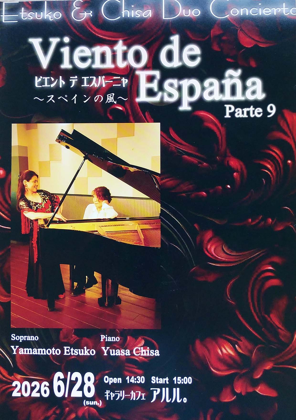 ■Etsuko & Chisa Duo Conciertoビエント デ エスパーニャ 〜スペインの風〜Parte 9 6月28日(日) 14:30開場 15:00開演 ソプラノ歌手、フラメンコの踊り手である山本悦子と ピアニスト湯浅ちさが送るスペイン音楽ライブ。 今年は情熱的かつ哀愁漂うスペインの魅力をテーマに モンボウの作品を取り入れました。 異国の風を皆様の心にお届けいたします !! シングルチケット3,500円 ペアチケット6,000円 全自由席 定員50名 チケットお取り扱い:音楽工房アトリエMINS https://atelier-mins.com 042-798-1728 アトリエMINS 090-1660-7831 山本 リーフレット 表 リーフレット 裏 |